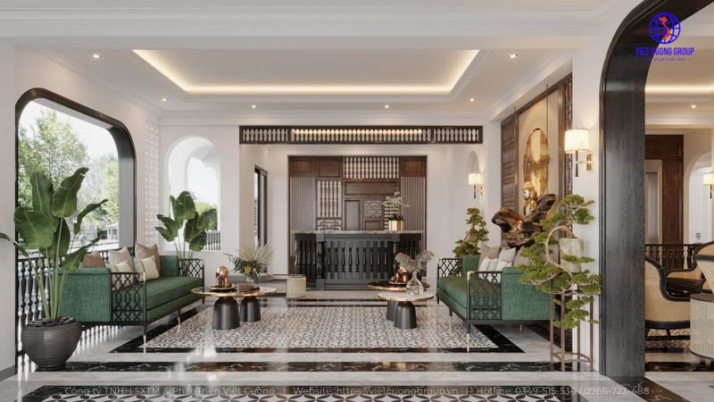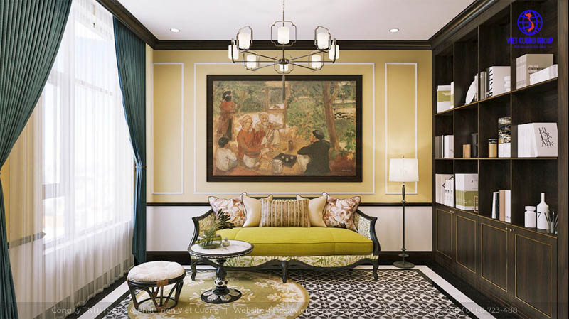 Phòng khách: Không gian phòng khách Indochine thường mang vẻ đẹp sang trọng, ấm cúng với bộ bàn ghế gỗ chạm trổ, bình phong, tranh Đông Hồ và các chi tiết trang trí bằng đồng.